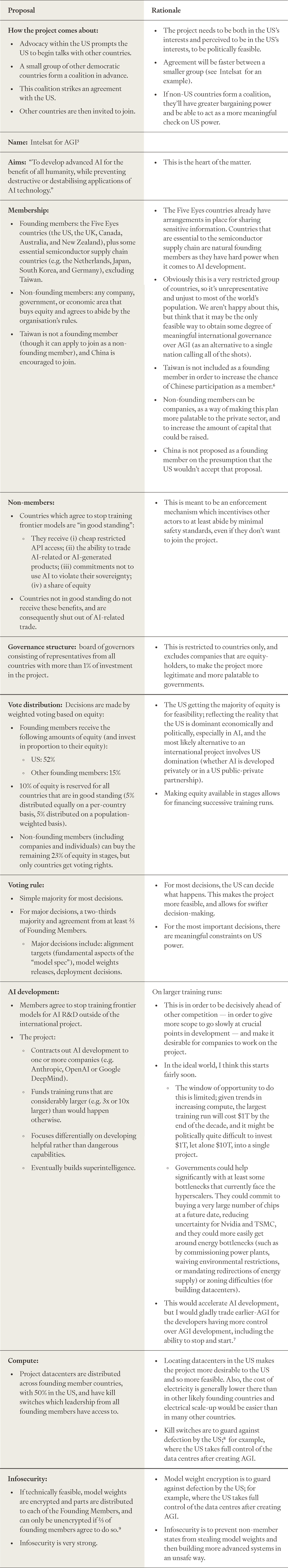 In this section I give my current best guess proposal for what an international AGI project should look like (there’s also a draft of the relevant treaty text in the appendix). My proposal draws heavily from Intelsat, which is my preferred model for international AGI governance.
