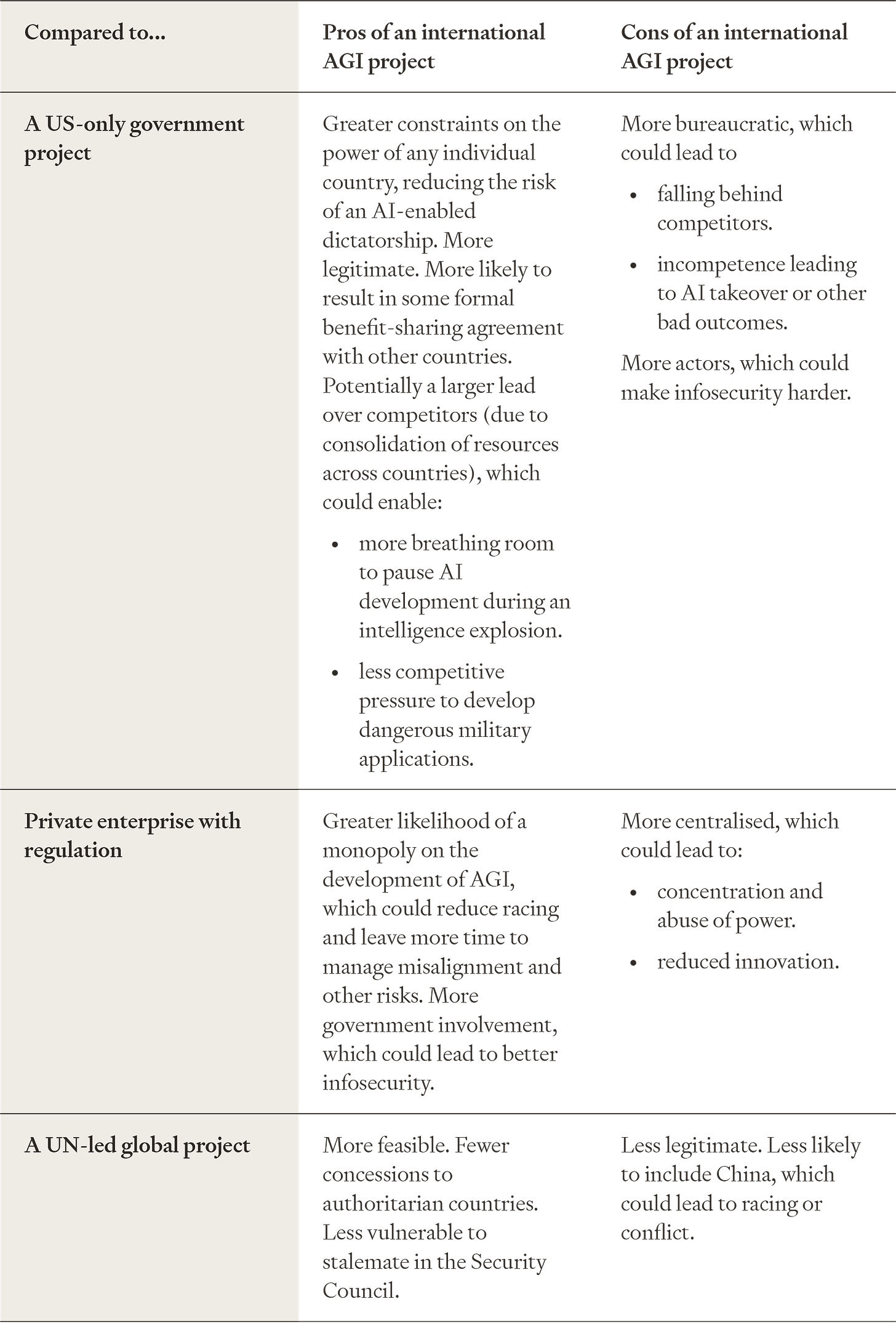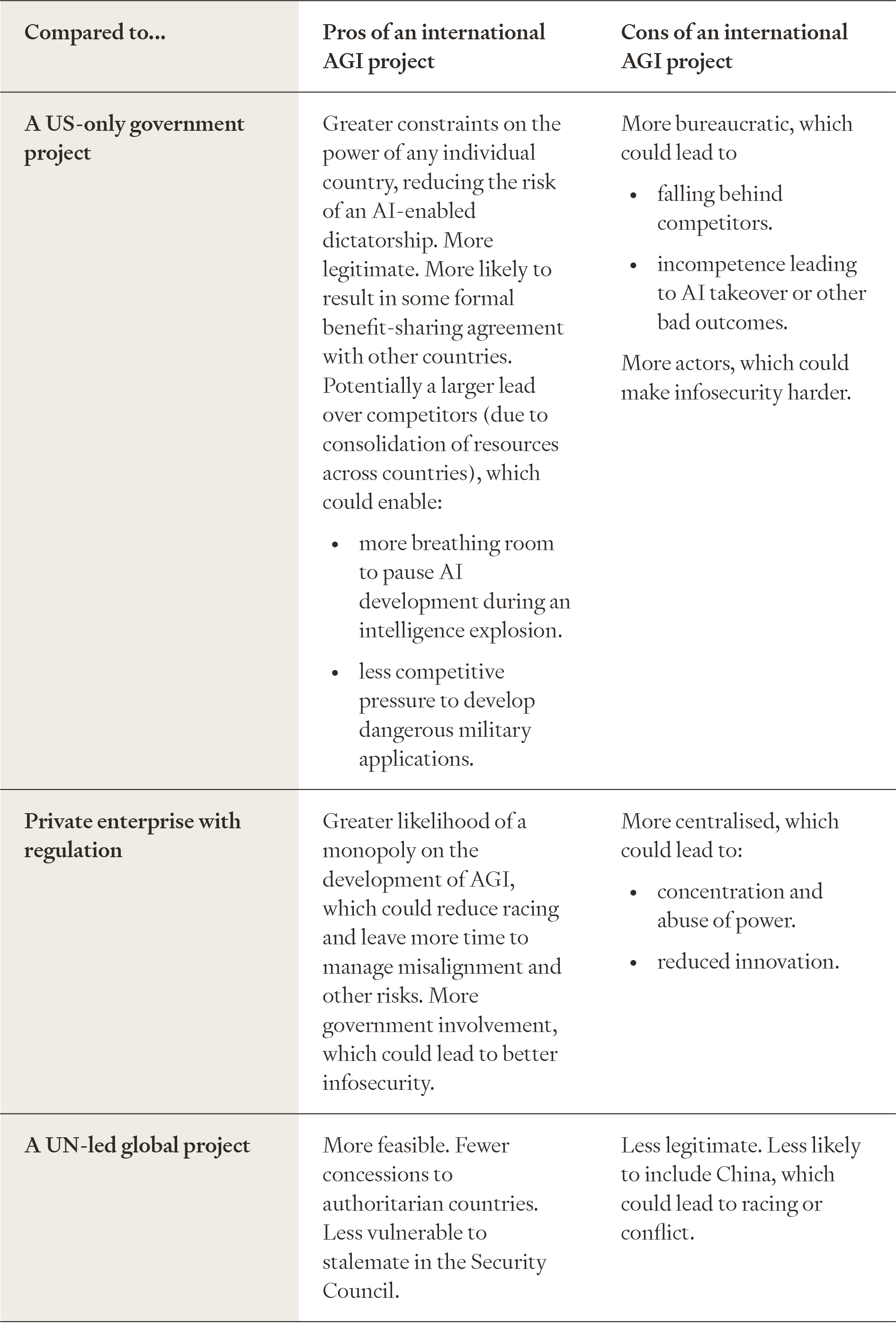 My tentative view is that an international AGI project is the most desirable feasible proposal to govern the transition to superintelligence, but I’m not confident in this view.2 My main hesitations are around how unusual this governance regime would be, risks from worse decision-making and bureaucracy, and risks of concentration of power, compared to well-regulated private development of AGI.3