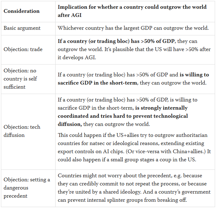 This doesn’t mean one country couldn’t outgrow the world. Again, consider the US and imagine that after AGI it’s >50% of GDP. If it suddenly ceases trade with the rest of the world, the outcome might be that all countries take a 3X short-term hit to output, still leaving the US with >50% of world output and on track to outgrow the world. With that strong a BATNA, the US might negotiate a trade deal that avoids that short-term hit to output for everyone, but leaves the US with the ability to ultimately outgrow the world. Or the US might gradually decouple from the rest of the world, such that its output never falls in absolute terms but its growth slows (relative to the counterfactual without decoupling). Gradual decoupling seems especially plausible.