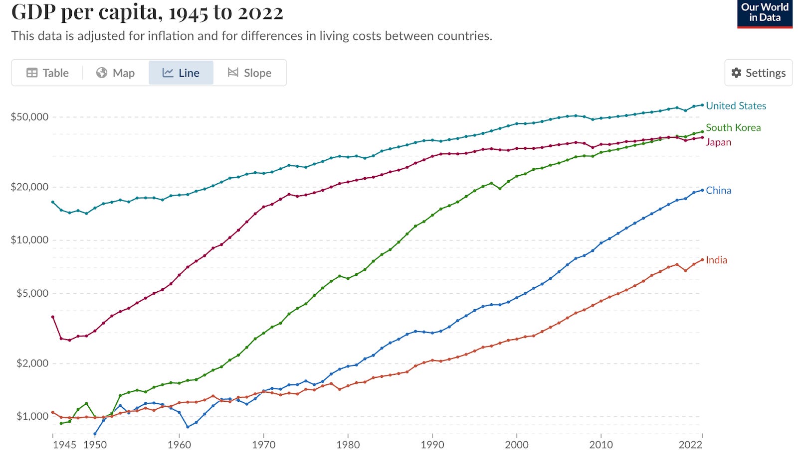 Indeed, during the 20th century many countries saw rapid “catch up growth”, where countries behind the economic frontier like China and Japan grew much more quickly than those at the frontier (e.g. the US) by adopting existing technologies.