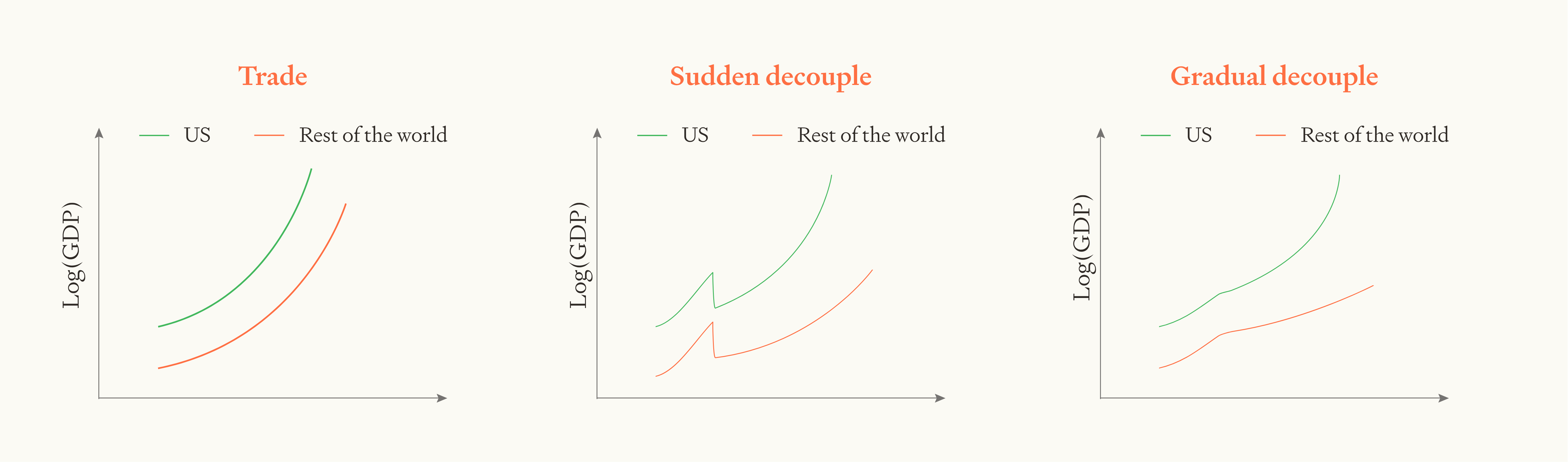 Wait, didn’t we say earlier that because the US’ BATNA here is outgrowing the world, they should be able to find a win-win trading deal where they still outgrow the world? Yes, but there we were imagining that the US and the rest of the world (RoW) were both unified actors. In that case, the US could in principle share technological insights with RoW at a high price, both US and RoW would benefit, and the US would still outgrow RoW. But in this paragraph we are discussing deals between a US firm and a RoW firm. Such deals have a large positive externality for RoW due to the technological diffusion: not only does the recipient firm get to use the technology directly, the RoW learns more about how to create that technology themselves. Such firm-to-firm deals help the US firm and the RoW firm directly, but the externality reduces the US’ share of future global GDP. So, to outgrow the world, the US would need to ban such deals and only sell its technology when RoW pays the US for the positive externality (which should be possible in principle, but would require a lot of very impressive coordination).