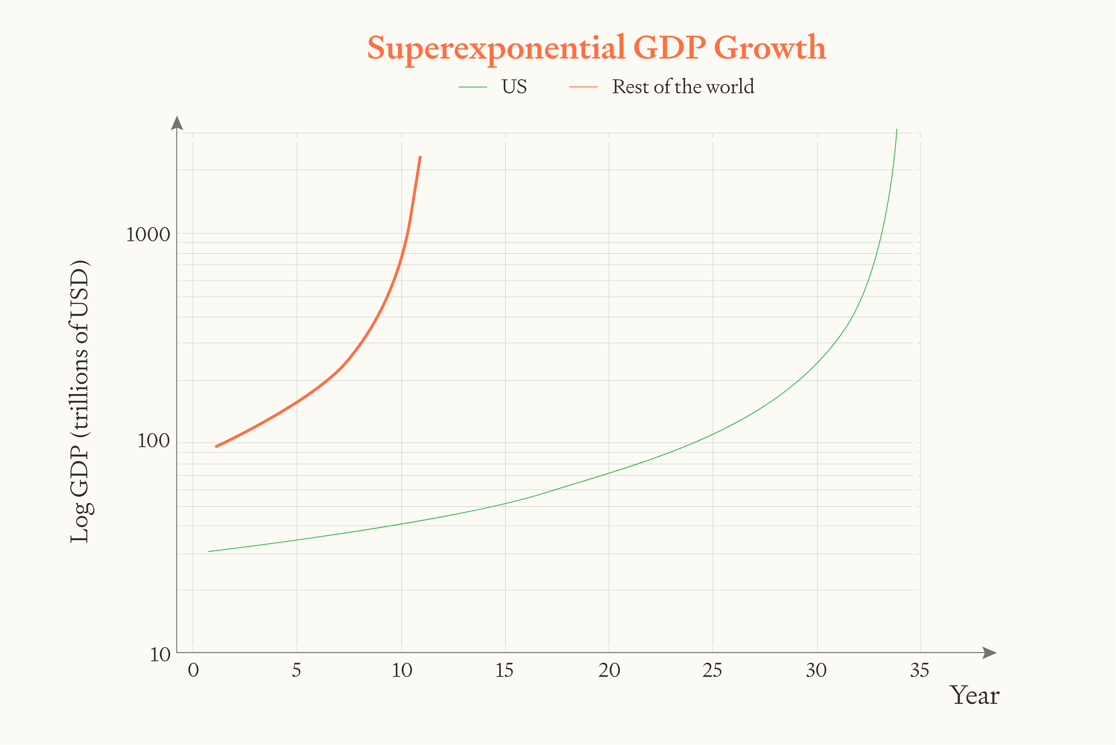 Let’s start with a simplified set-up where there’s no trade and no technology diffusion between countries. In this scenario, if the growth of each country becomes superexponential, then an initial lead in GDP will amplify over time as the bigger country will grow more quickly.